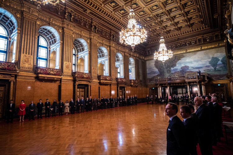 Rechtsanwalt Heiko Hecht, Honorarkonsul der Republik Armenien, im Gespräch mit dem 1. Bürgermeister der Freien und Hansestadt Hamburg im Kaisersaal des Rathauses. Anlass ist der jährliche Neujahrsempfang des Konsularkorps Hamburg.